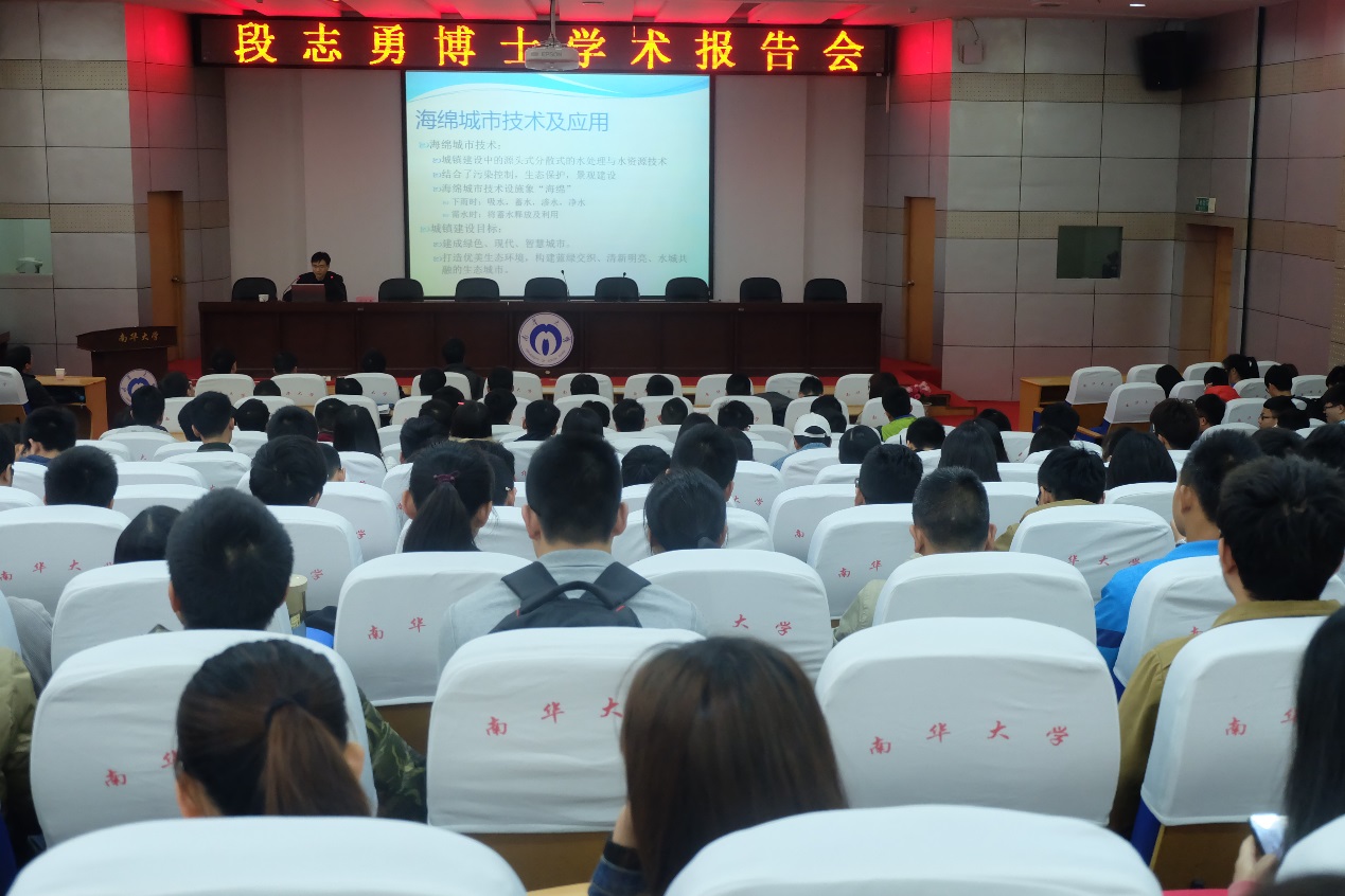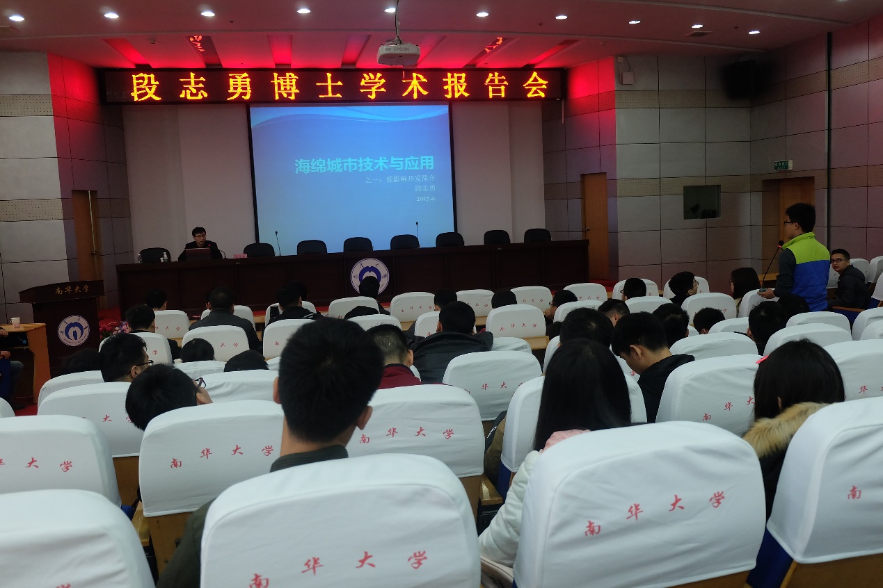 在报告会中,段博士向同学们详细介绍了海绵城市:海绵城市是城镇建设中源头式分散式的水处理与水资源技术,是一项结合了污染控制、生态保护和景观建设的综合性技术。在城镇建设过程中引入海绵城市概念的目标是要建成绿色、现代、智慧城市,打造优美生态环境,构筑蓝绿交织、清晰明亮、水城共融的生态城市。其要解决的主要是近年来十分严重的城市内涝、水资源缺乏与浪费和污染治理成本高昂等问题。