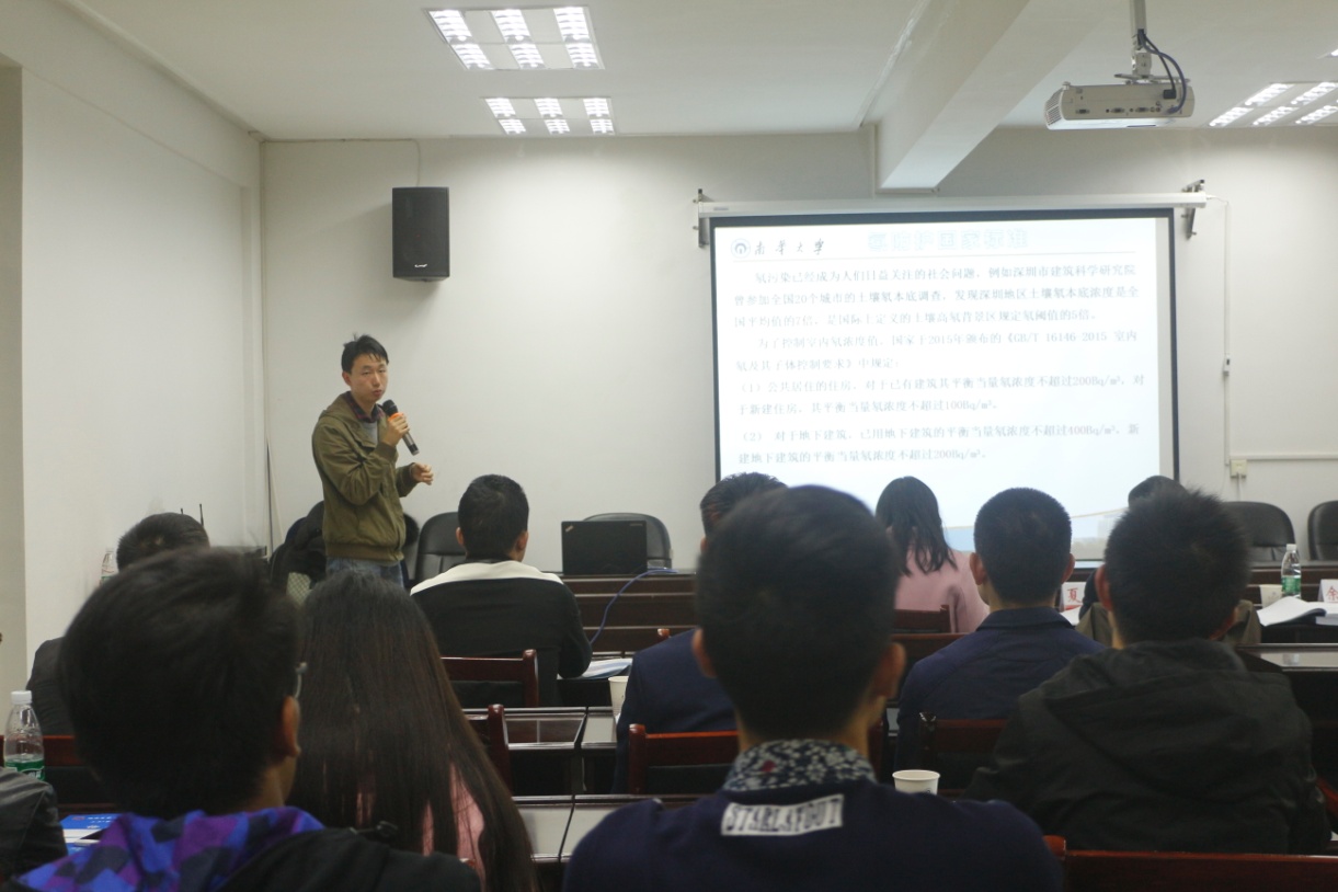 本次优秀论文宣讲会由优秀论文作者演讲、观众提问与专家点评三个环节组成。beats365唯一官方网站环境与安全工程学院的李铖俊首先作了题为《地下空间氡迁移的数值模拟研究》的报告,他在报告中介绍了利用CFD数值模拟研究室内温度、换气次数以及气流组织形式对室内氡浓度分布的影响。beats365唯一官方网站核科学技术学院的蓝浩洋、唐盛安,土木工程学院的李利成分别做了题为《核天体物理中p-过程相关的光核反应研究》、《三角铅屏蔽碘化纳晶体闪烁体探测器对放射源的定位》、《从自然辐射背景下分离出来的细菌克雷伯氏菌USCA1对铀(VI)的生物修复》的学术报告。最后,来自长沙理工大学的何倍同学以《具有超疏水功能的自发光水泥基路面材料性能研究及作用机制》为题作了报告,专家就其报告主题进行了全面而细致的点评。