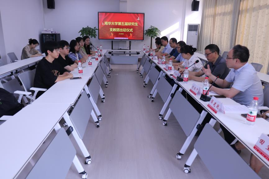 在出征仪式上,第五届研究生支教团团长谭雅佳代表全体支教团成员发言。她感谢学校能提供这次学习交流的机会和平台,并郑重承诺不辜负学校和领导老师们的殷切期望,以后将牢记初心使命,认真落实新时代教师职业行为准则,以勤奋踏实的态度完成教学任务,为农村教育事业的发展贡献青春智慧,在实践中书写人生华章。随后,刘振中书记对支教团同学们勇于担当、甘于奉献的精神予以高度赞扬,勉励大家在支教过程中要保持自强不息的青春气质,保持不畏艰辛的攻坚精神,保持锐意进取的奋斗韧性,充分展现南华学子的昂扬姿态。徐婵娟副书记也表示,支教对研究生来说是一次很好的锻炼机会,要坚持理论联系实际,争取做到学以致用,在实践中创新,在合作中成长。同时,她对支教团同学提出了殷切期望,勉励同学们始终践行教育的初心使命,在支教工作中传递爱的力量。李乐院长强调,希望支教团同学能够坚定信心,积极工作,在祖国最需要的地方贡献青春力量;能够牢记校训,奋力前行,传承好支教团的优良传统,并预祝支教团成员学有所成,学有所获,凯旋归来,预祝本次支教工作取得圆满成功。