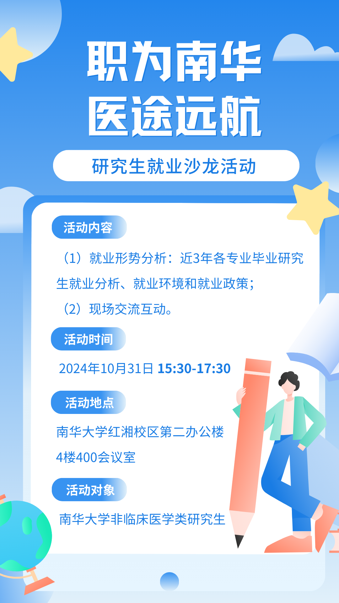 您还在为当前医学行业的就业形势与政策动态而感到困惑吗?为准确把握医学领域的职业发展趋势,以及提升就业意识和应对能力,促进研究生之间的经验交流与人脉拓展,顺利进入医学职场,“职为南华,医途领航”研究生就业沙龙——非临床医学专业专场欢迎您的到来!