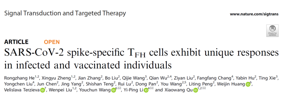 近日我校基础医学院瞿小旺研究团队,中山大学中山医学院李义平与中国食品药品检定研究院王佑春的科研人员合作在国际权威学术期刊Signal Transduction and Targeted Therapy(IF=39.3)发表了最新的研究成果“SARS-CoV-2 spike-specific TFH cells exhibit unique responses in infected and vaccinated individuals”。该成果是瞿小旺团队继在Nature Microbiology和Cell后取得的又一重要进展。