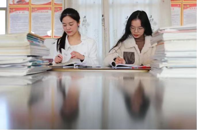 支教团成员谭雅佳(左)、张敏(右)正在进行备课