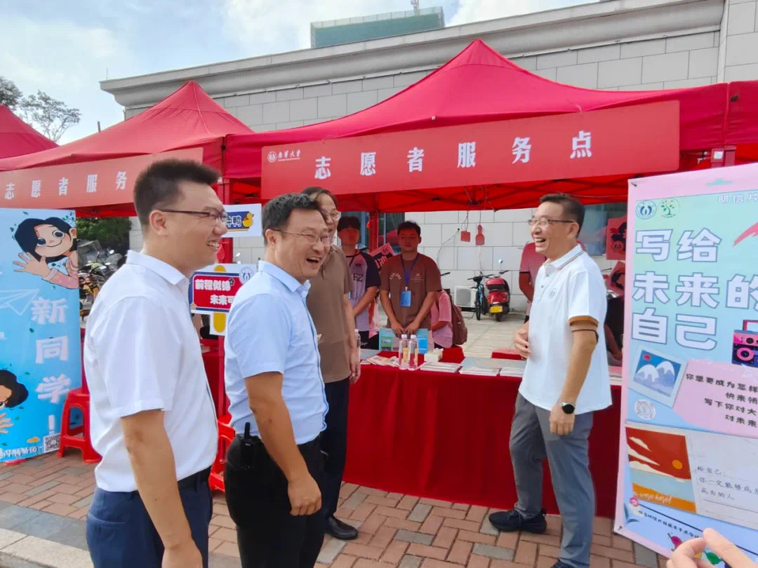 9月7号上午,学校党委书记高山、副校长于涛、保卫处处长温雪松、校团委副书记禹敏及相关部门负责人走访雨母校区迎新点,与新生和家长亲切交流,慰问参与迎新的师生员工和志愿者,了解迎新工作情况。在迎新现场,高山等校领导鼓励同学们尽快融入南华,好好学习、刻苦钻研,在自己的专业领域取得优异成绩,为全面成长成才打下坚实基础。