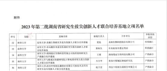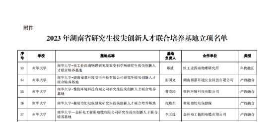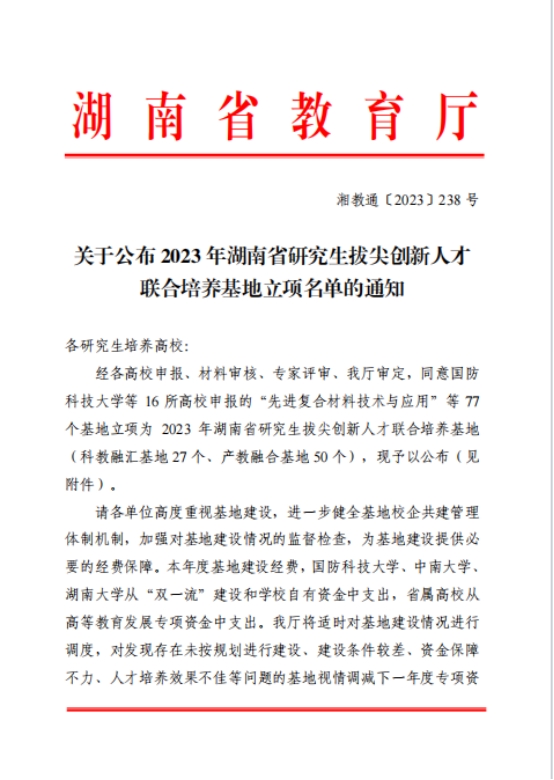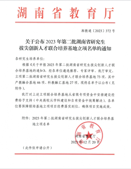 2023年,湖南省教育厅于8月和12月分别发布《关于公布 2023 年湖南省研究生拔尖创新人才联合培养基地立项名单的通知》(湘教通〔2023〕238号)、《关于公布 2023 年第二批湖南省研究生拔尖创新人才联合培养基地立项名单的通知》(湘教通〔2023〕372号),我校共10项研究生拔尖创新联合培养基地获批立项,其中产教融合基地7项,科教融汇基地3项。此次研究生拔尖创新人才联合培养基地的成功获批,是我校深化研究生教育产教融合、科教融汇取得的重要突破。