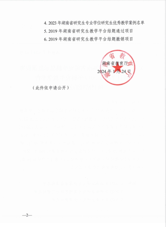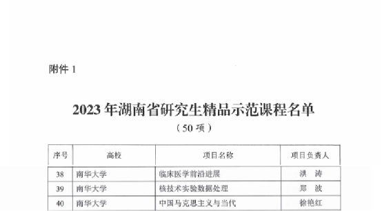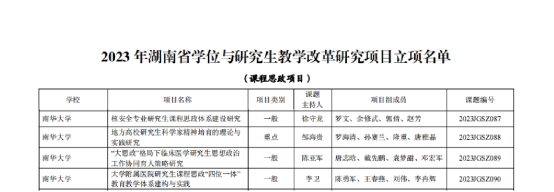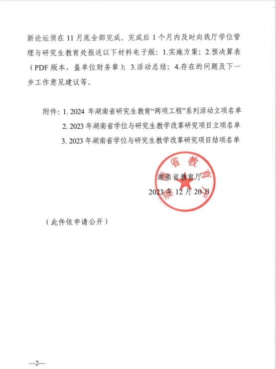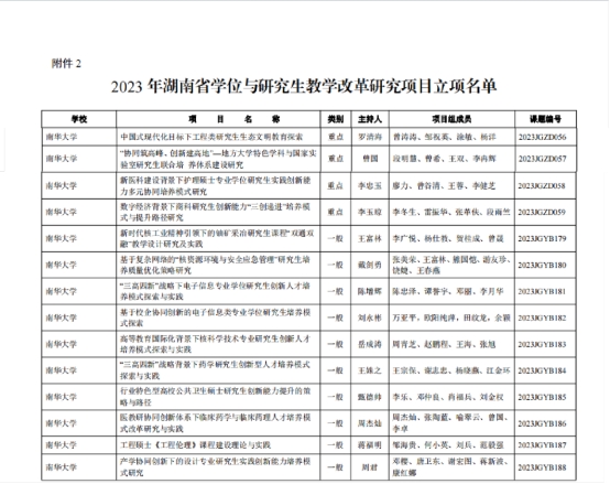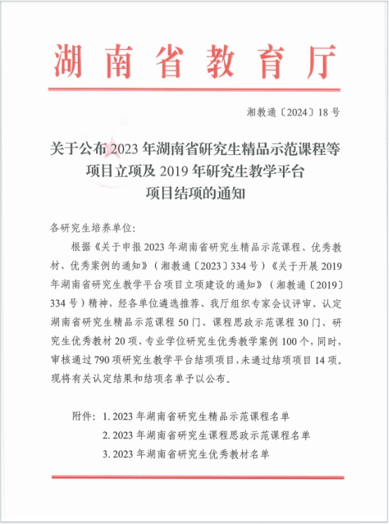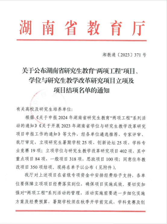 2023年12月,湖南省教育厅公布了《关于公布湖南省研究生教育“两项工程”项目、学位与研究生教学改革项目立项及项目结项名单的通知》(湘教通〔2023〕371号),我校获得湖南省学位与研究生教学改革研究项目18项。2024年1月,湖南省教育厅公布《关于2023年湖南省研究生精品示范课程等项目立项及2019年研究生教学平台项目结项的通知》(湘教通〔2024〕18号),我校获得湖南省研究生精品示范课程3门,课程思政示范课程2门,专业学位研究生优秀教学案例6个,是我校深化研究生教育改革创新而取得的成绩。