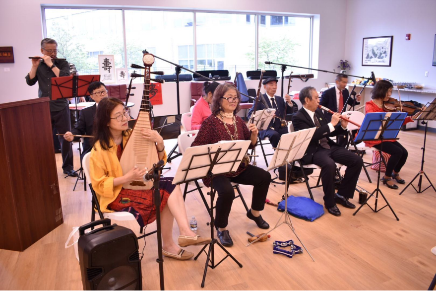 倪后萍在当地社区活动中弹奏琵琶