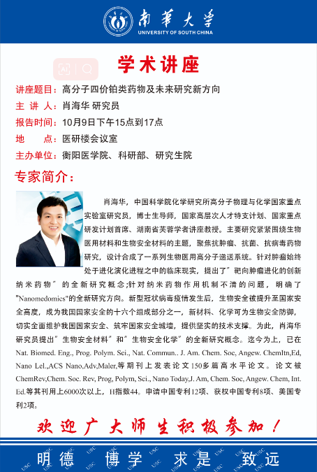 上一条:王从洋教授学术报告会-过度金属催化循环的构建 下一条:在科研创新道路上矢志追求卓越的衡医人——专访79级临床医学校友倪后萍—2023年诺贝尔生理学或医学奖获奖项目论文作者之一